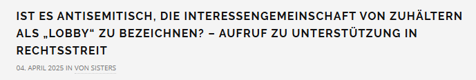 Abgesehen davon, dass ich das so nie gesagt habe, und auch nicht ausdrücken würde: Von einer „Interessengemeinschaft von Zuhältern“ sprach der Verein meines Wissens vorher nie – und ich las in den letzten Jahren recherchebedingt viele Texte und Zitate von Sisters. Sisters umgeht so den Begriff „Prostitutionslobby“, behält aber die Argumentation, von Sisters abweichende Meinungen automatisch Zuhältern, Profiteur*innen oder „System Prostitution“ zuzurechnen, bei.