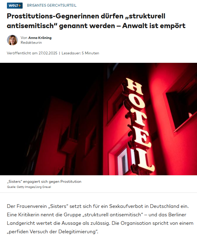 Zum Schluss noch zum Selbstbild solcher Organisationen, das leider bislang bereitwillig von den meisten Medienschaffenden und Politiker*innen übernommen, statt in Frage gestellt wird. Sisters beschreibt ihre Tätigkeiten so: Ausstiegshilfe, Aufklärung und politische Arbeit für das „Nordische Modell“. Wann hinterfragen Menschen Organisationen wie Sisters und ihre Argumentation auf Plausibilität, Fakten und Umsetzbarkeit? Auch sie sollten sich Kritik stellen müssen, statt einen Retter*innen-Freifahrtsschein ausgestellt zu bekommen.